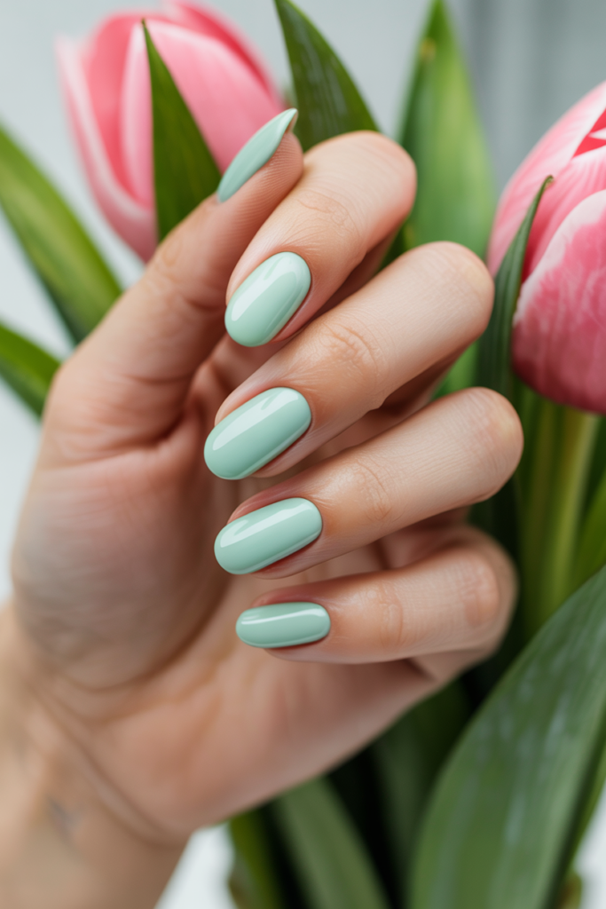 Glossy mint green nails offer a clean and fresh look. This shade works well for spring, combining softness with a modern shine. It pairs easily with floral or minimalist designs to create simple yet stylish manicures.