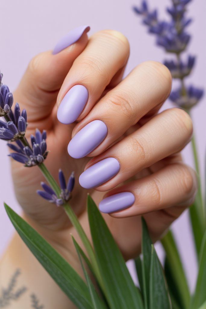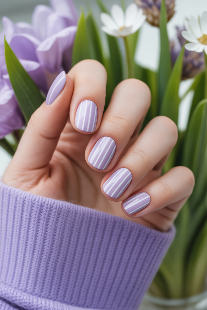 Lilac nails with minimalist stripes create a clean, modern look. Soft purple polish pairs well with thin, vertical lines for subtle detail. This style suits anyone who prefers simple yet stylish designs for spring. It works on all nail shapes and adds a touch of elegance without being too bold.