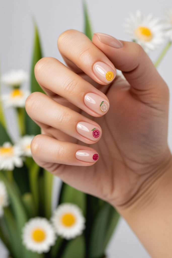 Nude nails create a clean, simple base that suits any look. Adding tiny fruit details gives a fresh, playful touch without being too bold. Small strawberries, lemons, or cherries stand out nicely on soft nude tones. This style blends subtlety with a fun, seasonal twist.