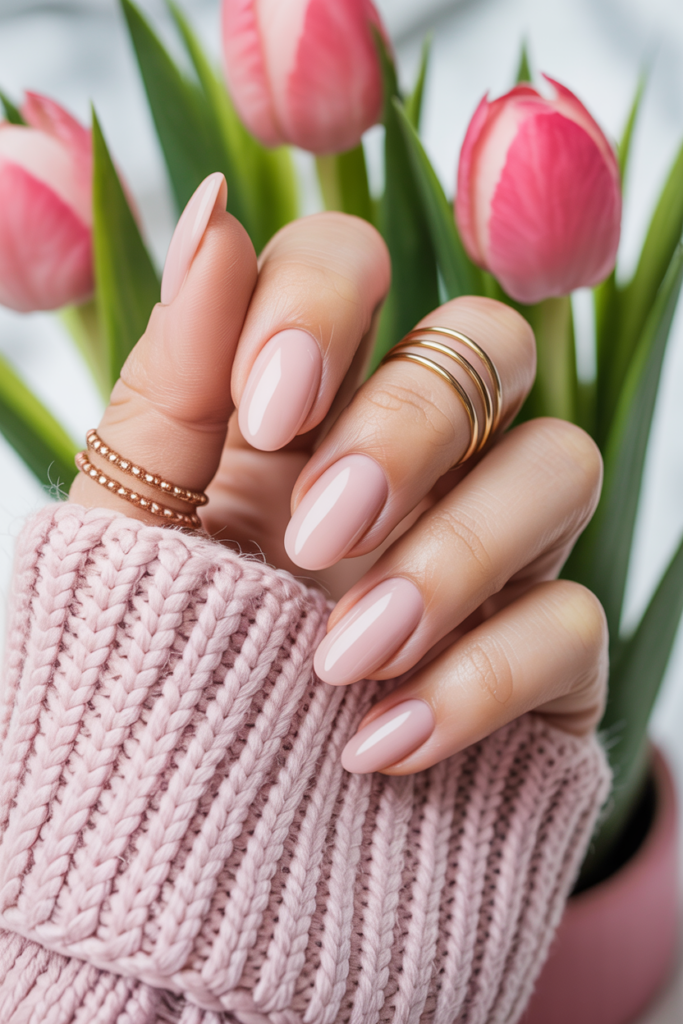 The pale pink glossy look is simple and elegant. It adds a soft, fresh feel that suits any spring outfit.
