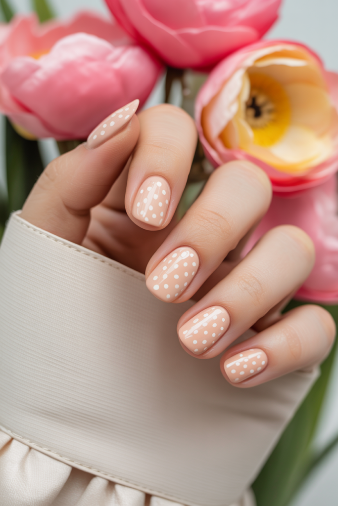 This design uses a soft peachy nude polish as the base. Small white dots are added on top for a simple but playful touch.