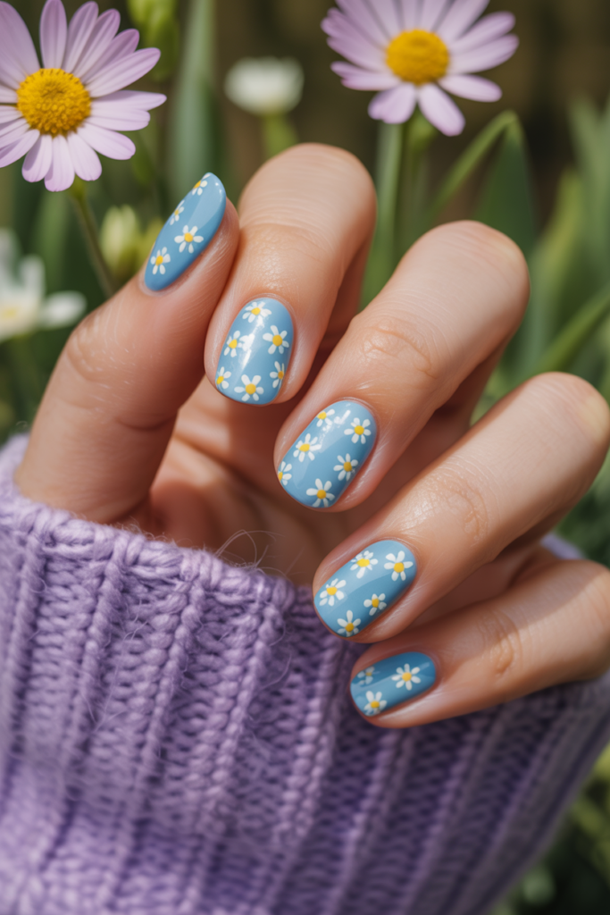 Sky blue nails with tiny flowers create a soft, fresh look ideal for spring. The light blue base adds a calm, airy feel.