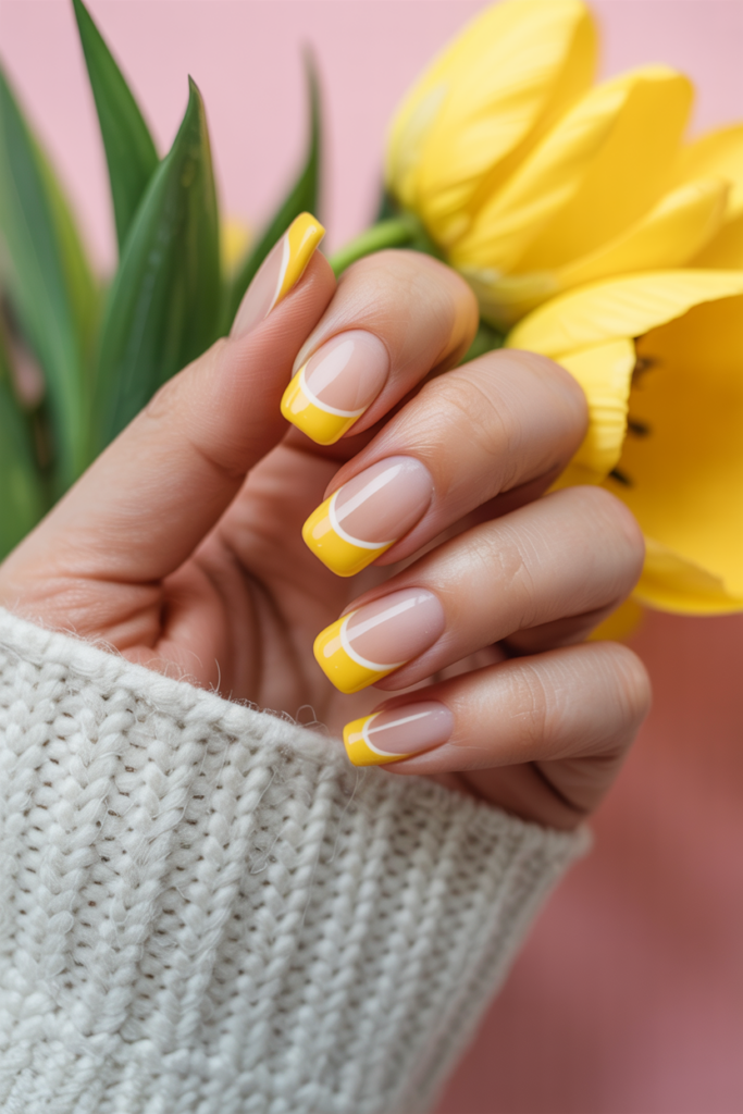 Sunny yellow tips add a bright, cheerful touch to any nail look. They pair well with natural or pastel bases, creating a fresh, simple style.