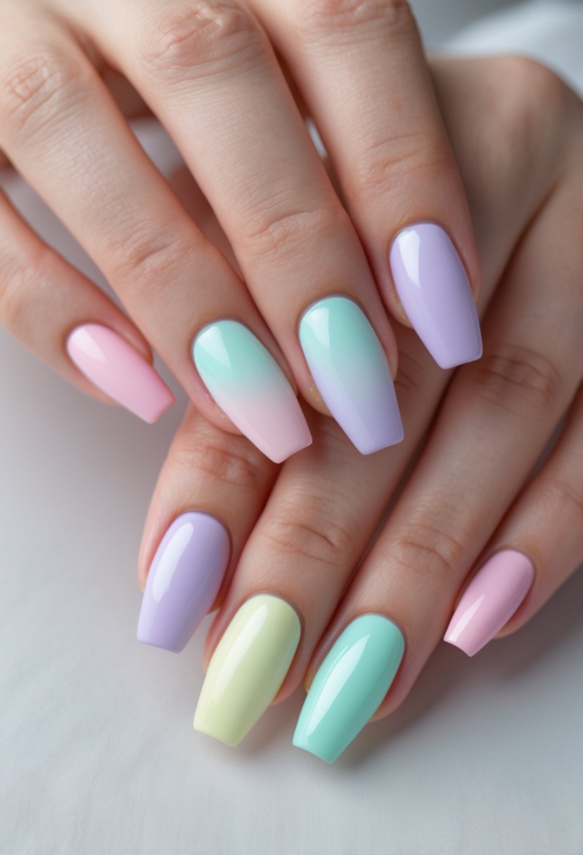 Pastel ombre gradients blend soft colors smoothly from one shade to another. This style uses gentle hues like pink, lavender, and mint, creating a fresh and subtle look.
