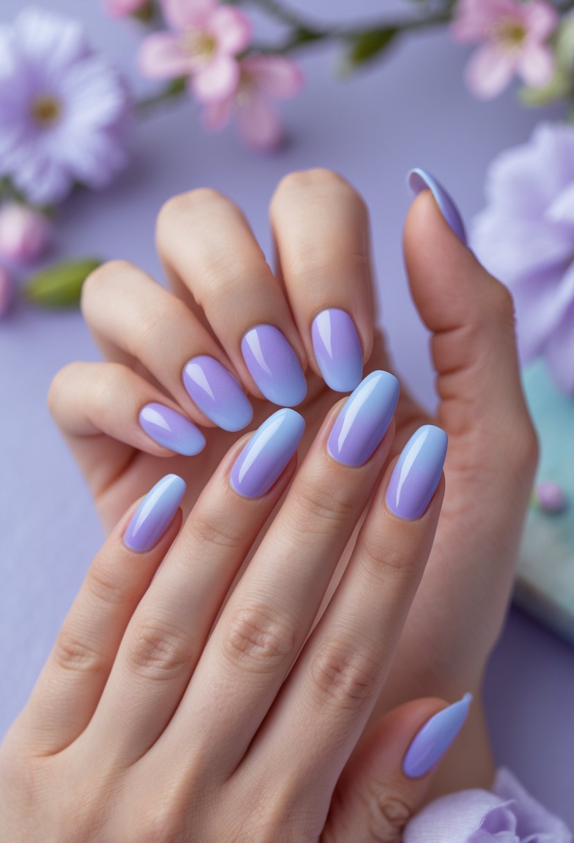 Periwinkle ombré nails blend soft blue and purple tones for a fresh spring look. The gradual color shift adds depth without being too bright. This style fits well with both casual and more polished outfits. It offers a subtle yet trendy way to wear pastel shades.