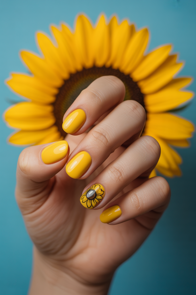 Yellow sunflower highlights add a bright touch to any nail design. They bring warmth and a fresh look perfect for spring. Using different yellow shades can create depth and make the flowers stand out. These accents work well on both short and long nails.