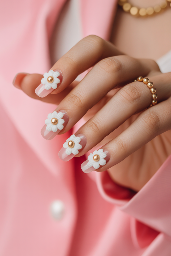 White daisy nail art offers a clean, fresh look perfect for spring. The bright white base pairs well with small daisy designs, creating a simple and cheerful style. This design fits both casual and formal occasions, adding a subtle touch of nature to the nails.
