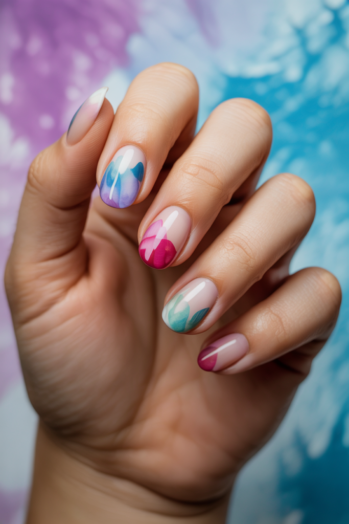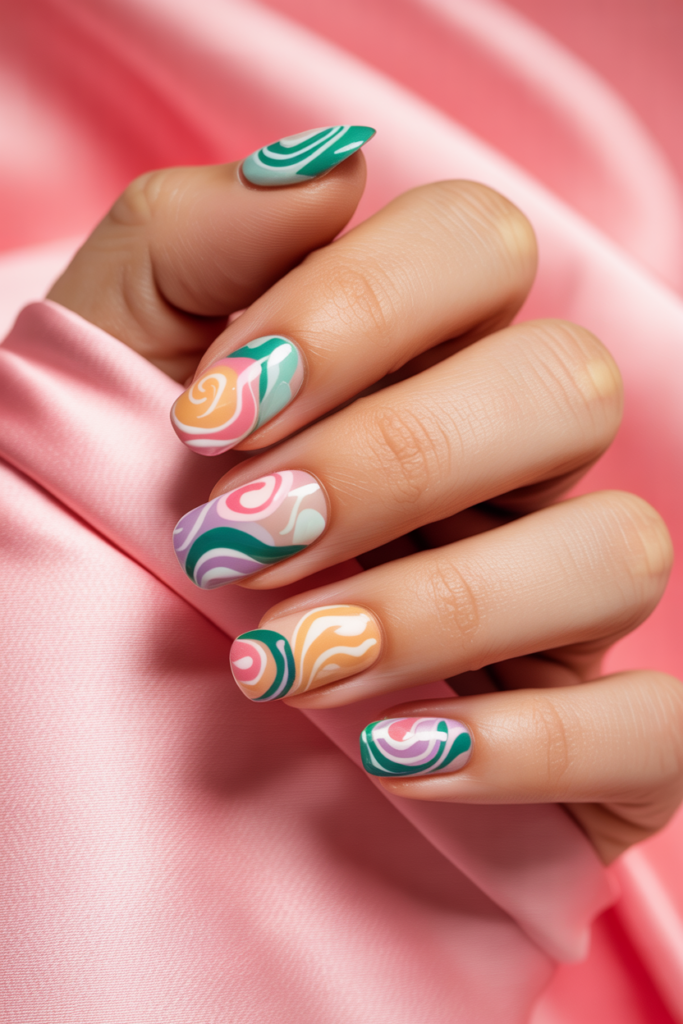 Abstract floral swirls blend flower shapes with flowing, curved lines for a modern look. This design uses soft colors and smooth patterns to create a stylish, artistic effect. It works well on all nail lengths and adds a subtle yet creative touch to any spring manicure.