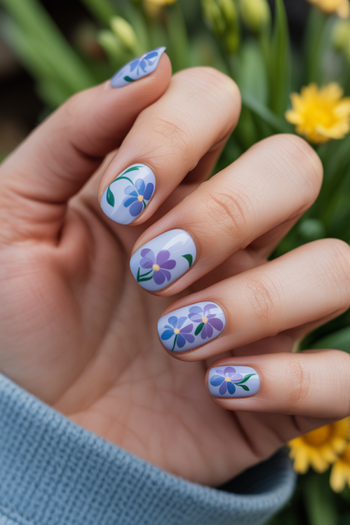 This design blends soft blue and violet flowers on a neutral base. The petals are delicate and hand-painted, giving a natural look. Small green leaves add a fresh, springtime touch. It suits those who like subtle yet elegant nail art.