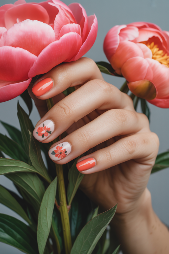 Coral peony accents add a soft, elegant touch to spring nail designs. The warm coral shade highlights the delicate layers of the peony petals. This combination creates a look that is both fresh and stylish for the season.