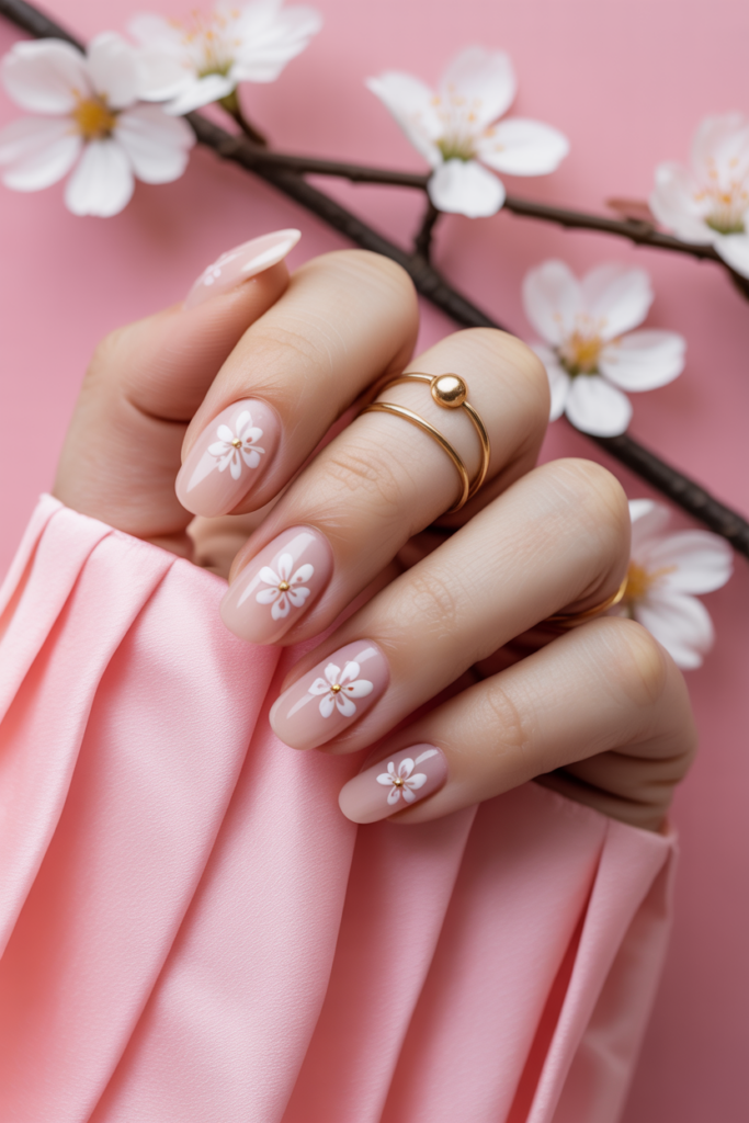 This design features soft baby pink petals painted delicately on a neutral or pale pink base. It brings a gentle, timeless look that suits spring well. The simple blossoms are perfect for those who prefer subtle yet elegant nail art.