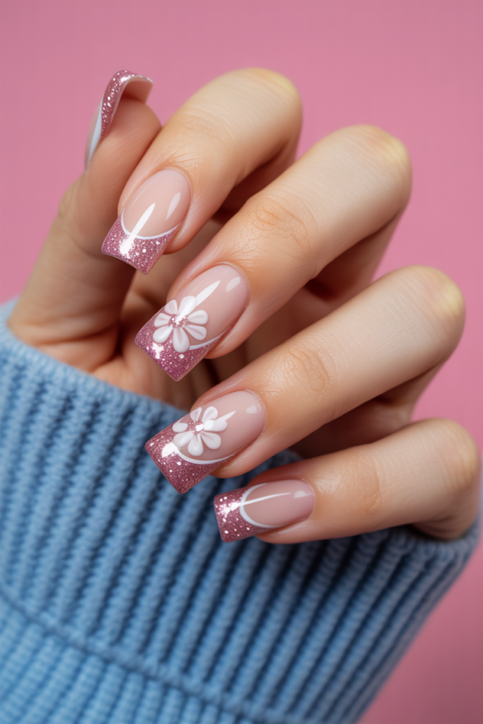 Glitter-embedded flower tips add a subtle sparkle to floral nail designs. The glitter highlights the edges, creating a delicate shine without overpowering the flowers. This style works well with soft pastels or bold colors, making it a versatile choice for spring.