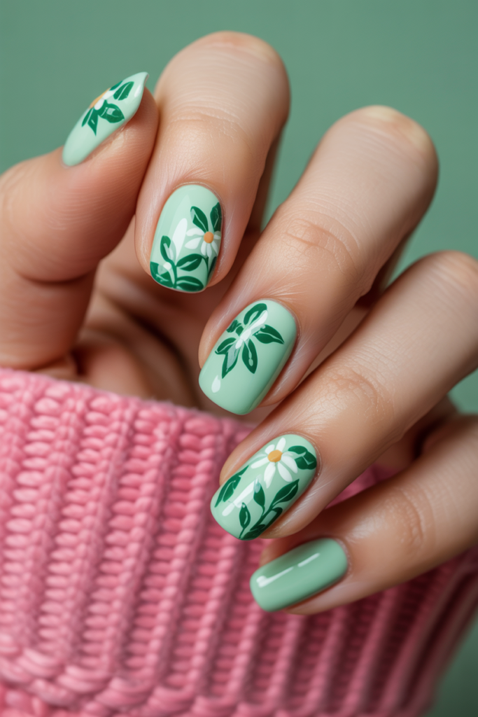 This design combines a soft mint green base with delicate floral and leafy patterns. The leaves add a natural, fresh touch that complements the flowers well.