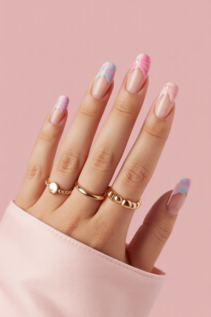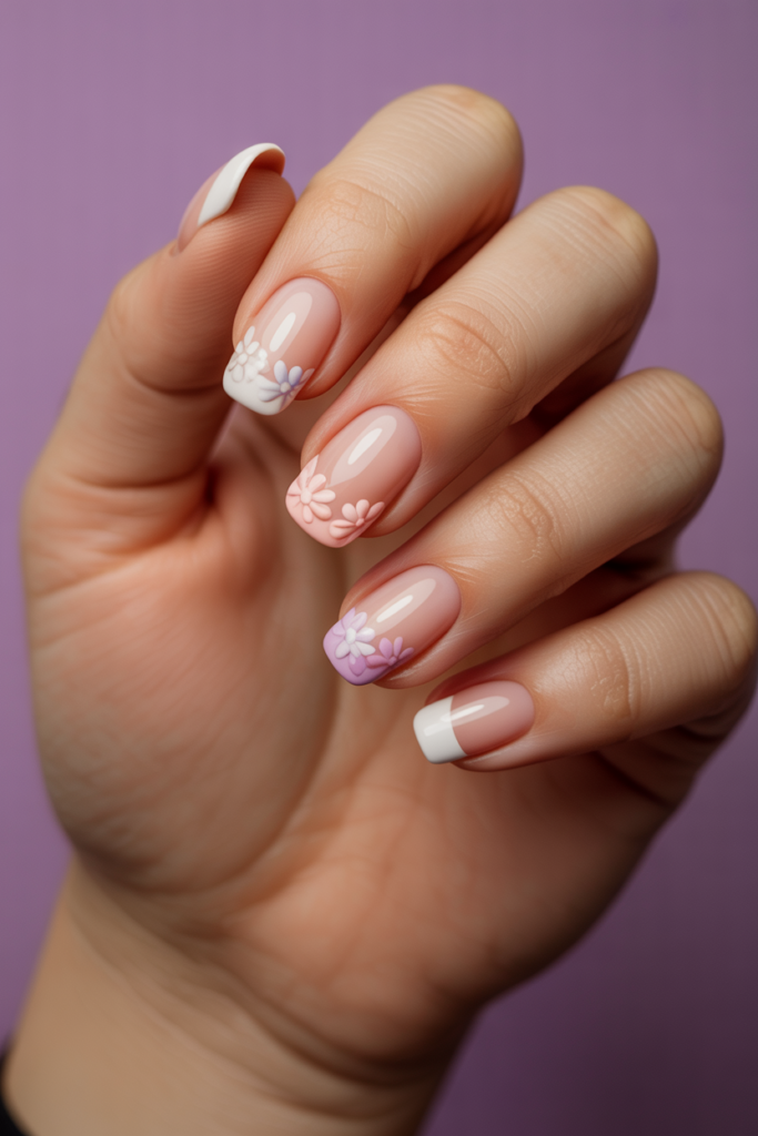 Pastel pink floral tips combine soft pink shades with delicate flower designs. The flowers are usually hand-painted in light colors like coral or orange. This style gives a gentle, fresh look that fits well with spring fashion. It is subtle but adds a touch of elegance.