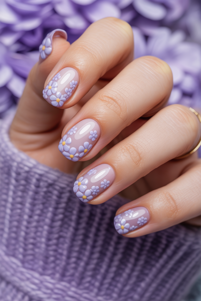Soft lilac shades create a calm and elegant base for floral nail art. Small flower clusters add delicate detail without overwhelming the design. This look works well for both casual and formal occasions, offering a subtle nod to spring’s gentle beauty.