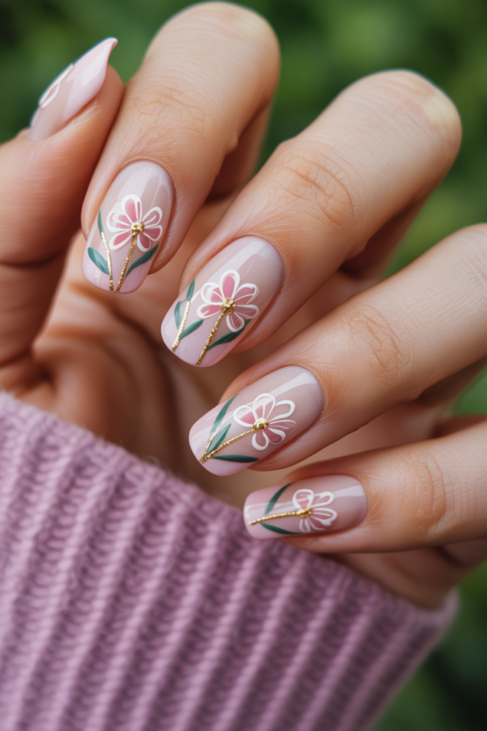 This design features delicate flower stems highlighted with thin golden lines. The metallic gold adds a subtle shine without overpowering the floral elements. It works well on neutral or pastel bases, creating an elegant and refined look for spring nails.
