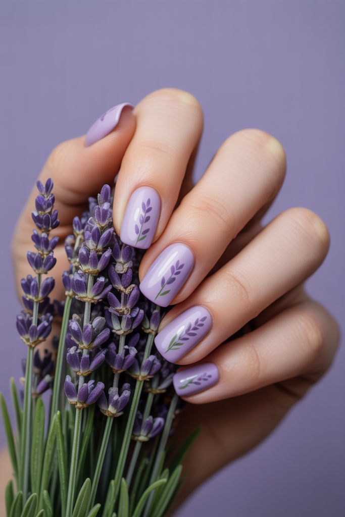 This design features small, delicate lavender sprigs painted in soft purple shades. The tiny flowers add a subtle touch of nature. It works well on short or medium-length nails for a clean, fresh look. The simplicity makes it perfect for everyday wear.