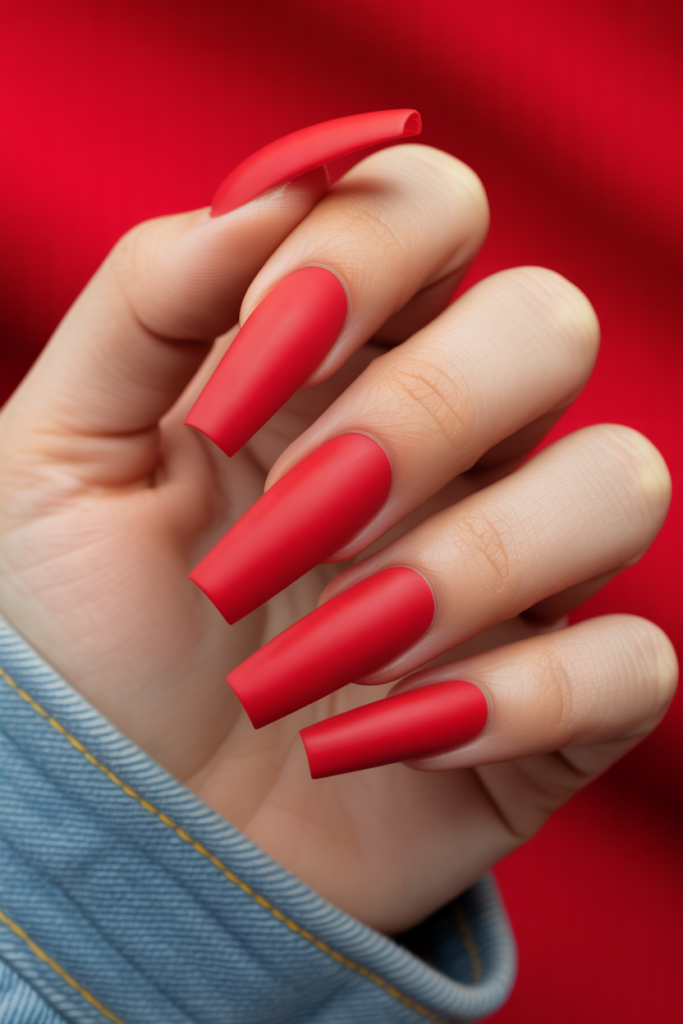 Bold red acrylic coffin nails stand out with their strong and stylish shape. The matte finish adds a soft, velvety texture that feels modern and unique. This look works well for anyone wanting a confident yet understated nail design this spring.