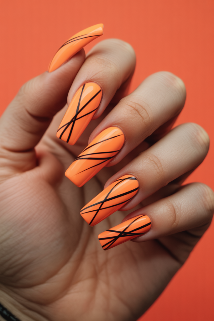 18) Bright Orange Coffin Nails with Black Abstract Lines