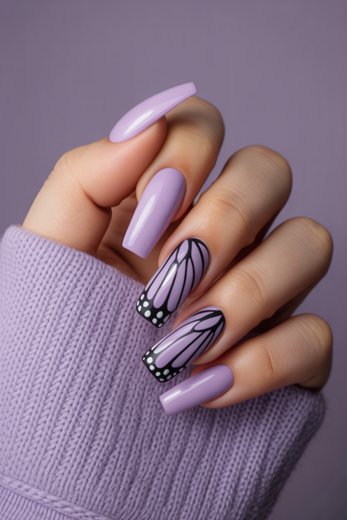 The butterfly wing design on lavender coffin nails offers a soft and elegant look. The delicate purple base highlights detailed butterfly patterns, creating a fresh and natural feel. This style suits those who want a subtle yet eye-catching manicure for spring.