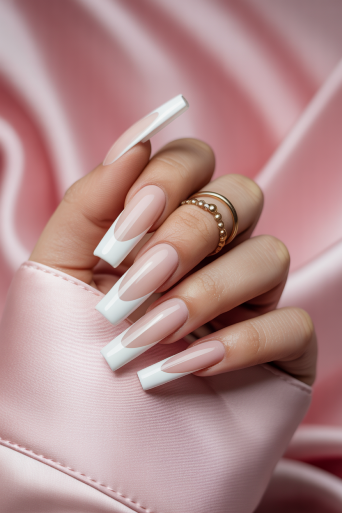 The classic French tip suits long coffin nails well, combining simplicity with elegance. The clean white tips contrast with the natural nail base, creating a timeless look. This style works for many occasions and complements both casual and formal outfits.