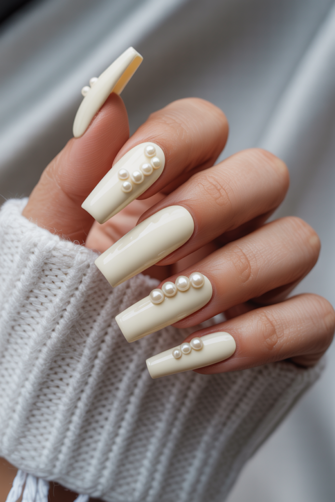 21) Creamy White Coffin Nails with 3D Pearls
