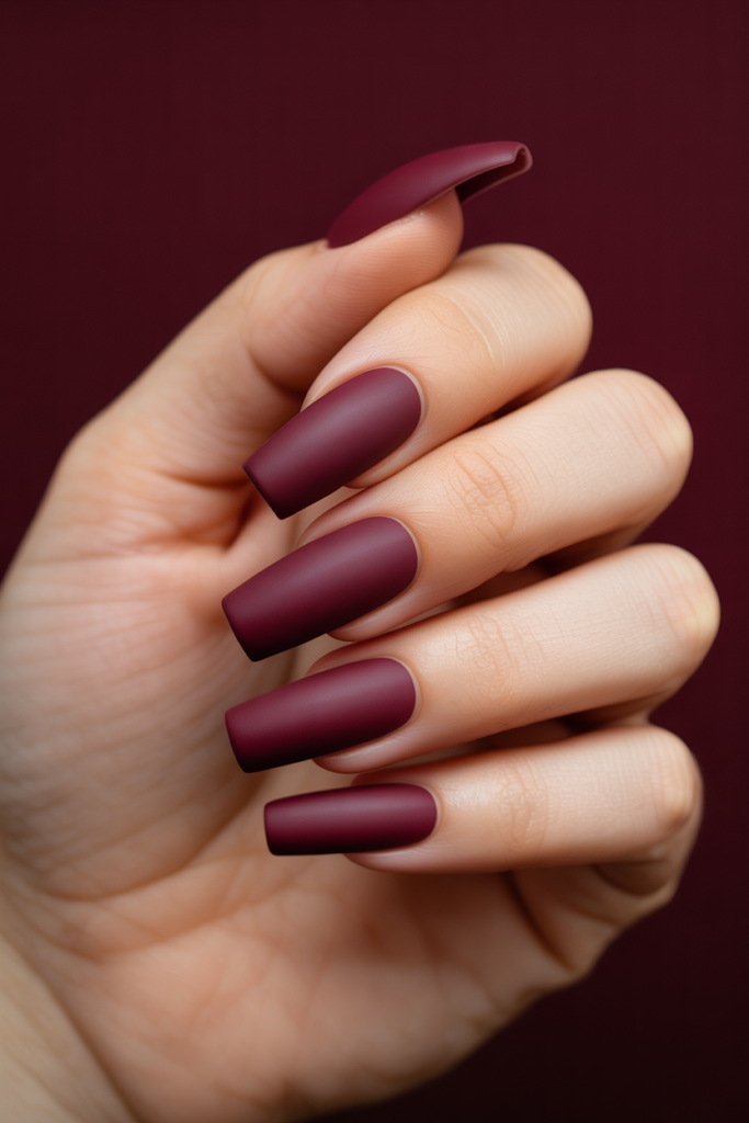 Deep burgundy matte coffin nails offer a rich, subdued look. The matte finish adds a modern edge to the classic dark red shade.