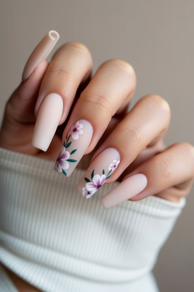 Matte nude coffin nails create a soft, understated base. Adding delicate floral accents brings subtle elegance without overpowering the look.