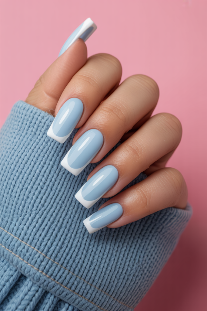 This style features a smooth, shiny baby blue base that looks clean and fresh. The white tips add a sharp contrast, giving the nails a neat, modern appearance.