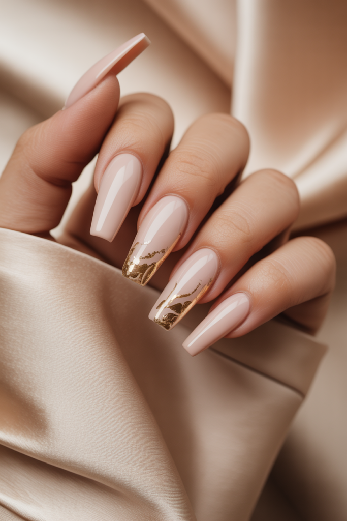 6) Minimalist Nude Coffin Nails with Gold Foil