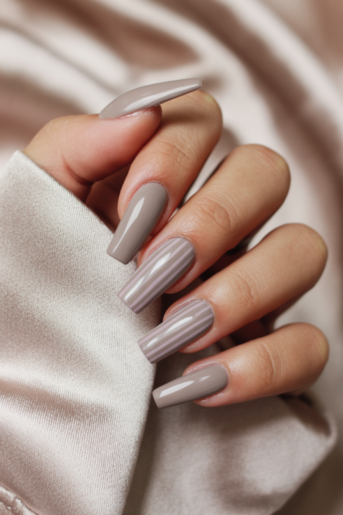 19) Muted Taupe Coffin Nails with Subtle Stripes