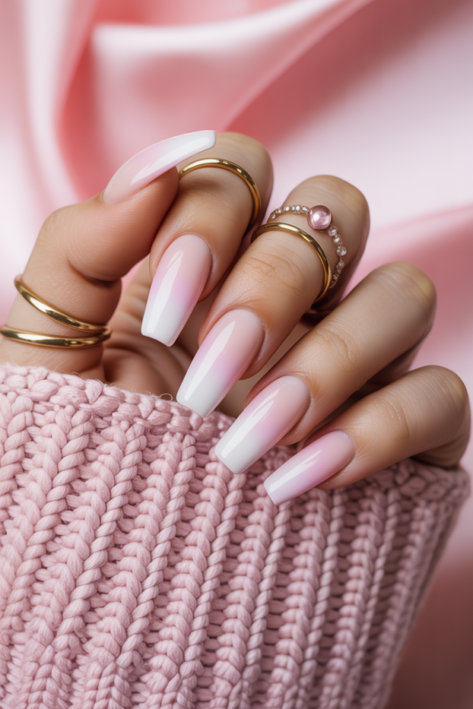 Pastel pink ombre coffin nails blend soft pink shades with a smooth color fade. The coffin shape adds a modern edge. This style suits spring with its light, fresh look. It works well for both casual and formal occasions.