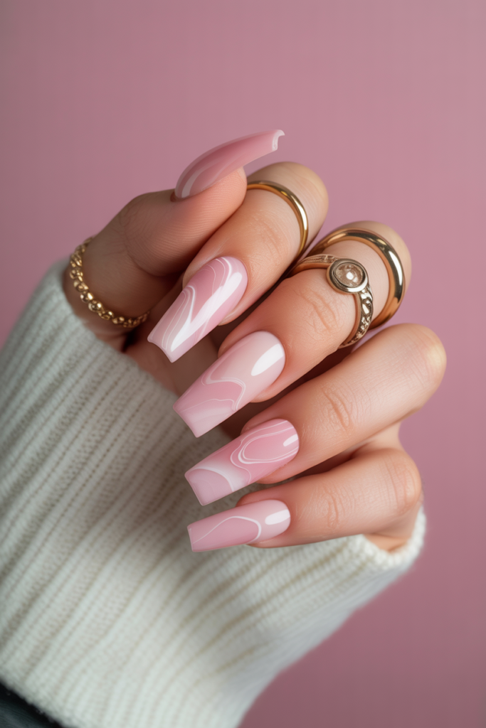 17) Pink Marble Effect on Acrylic Coffin Nails