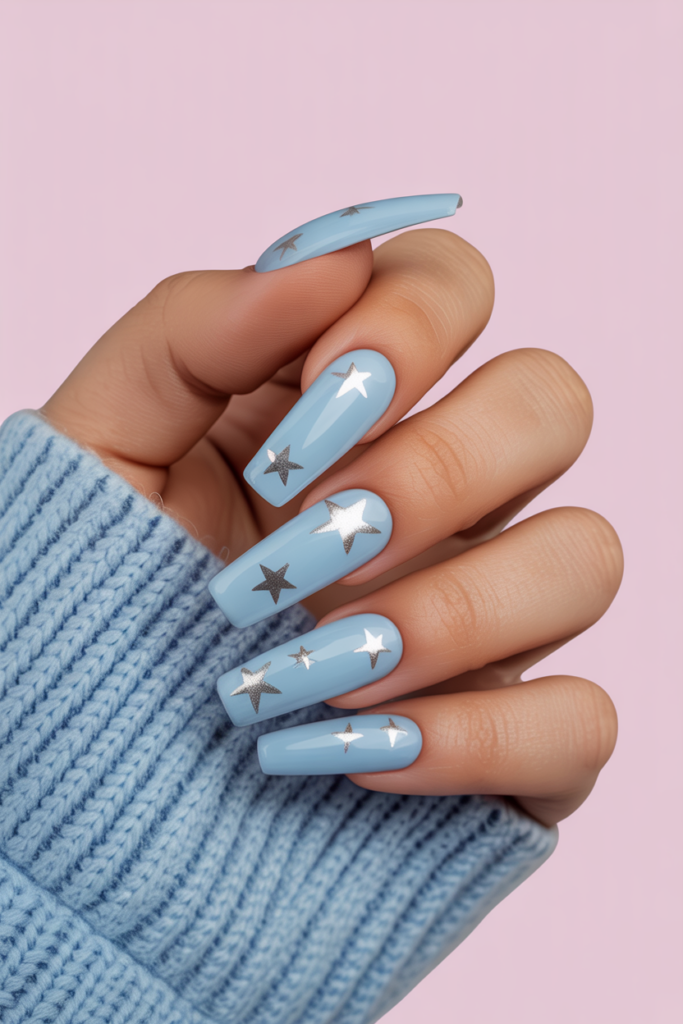 22) Powder Blue Coffin Nails with Silver Stars