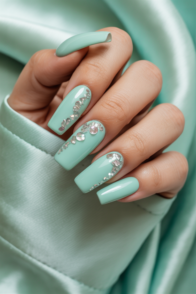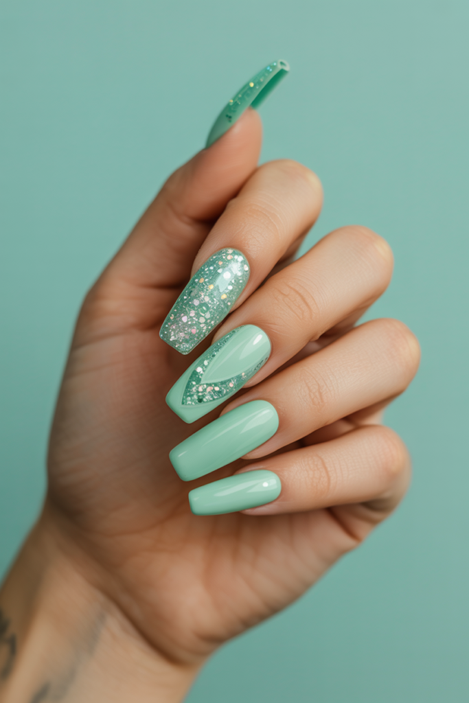 Soft mint green coffin nails offer a fresh and calm look. Adding silver glitter gives a subtle shine that catches light without being too bold.