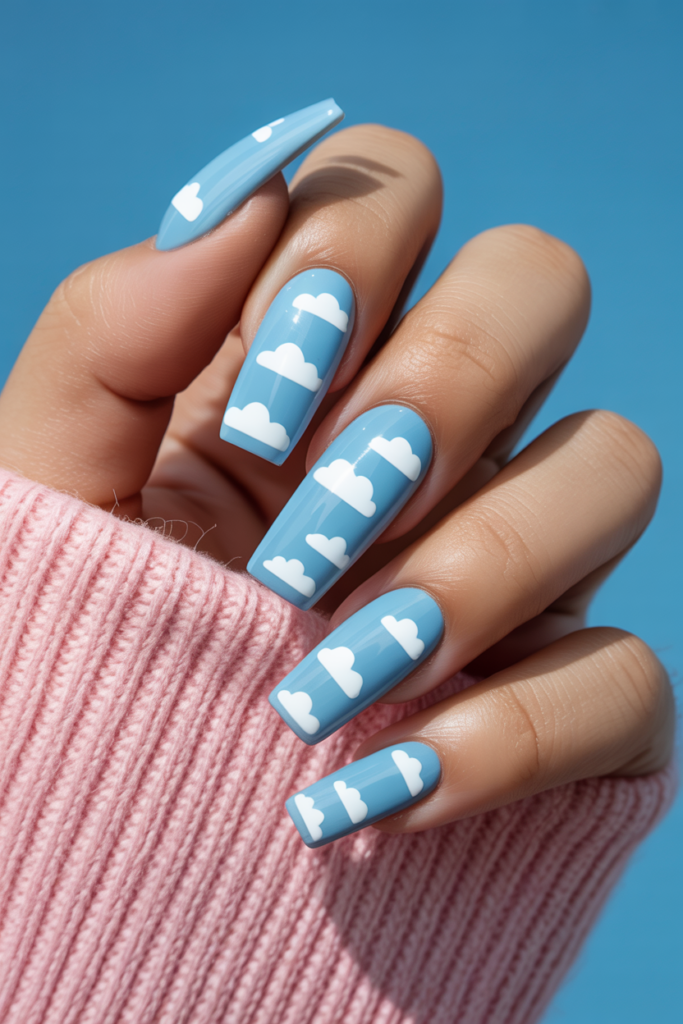 11) Sky Blue Coffin Nails with White Clouds