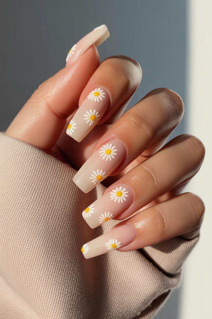 13) Soft Beige Coffin Nails with Tiny Daisies