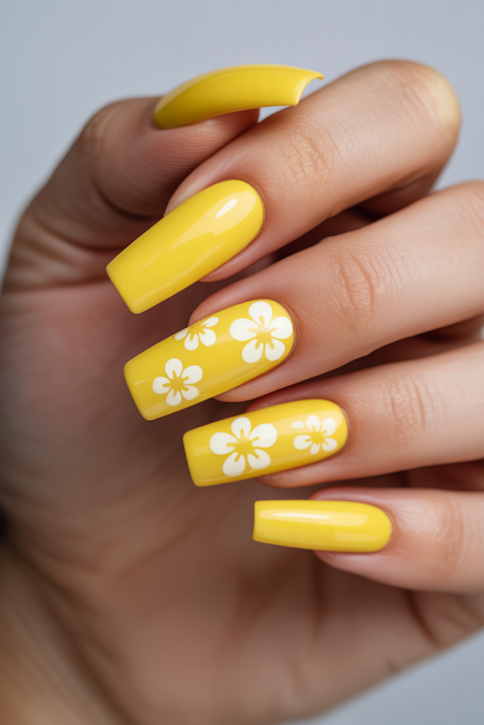 15) Sunshine Yellow Coffin Nails with White Flowers