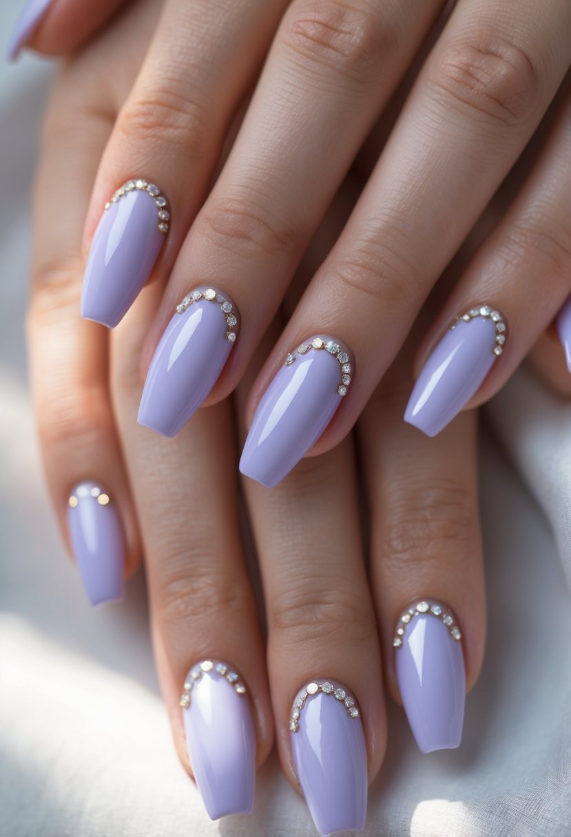 14) Lilac Coffin Nails with Rhinestone Accents