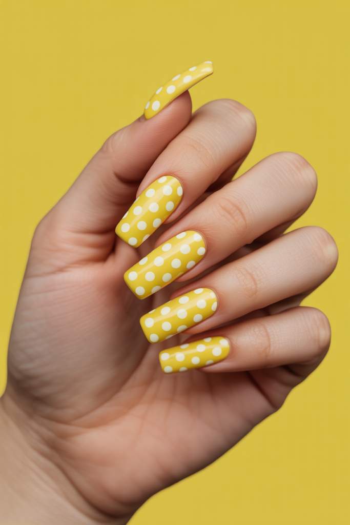 Yellow and white polka dot coffin nails create a fresh and playful look. The bright yellow base pairs well with white dots for a clean, spring feel. This design adds fun without being too bold, making it suitable for many styles and occasions.