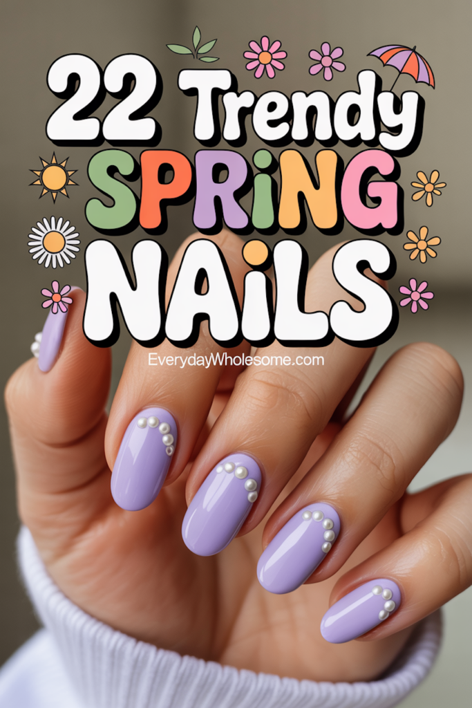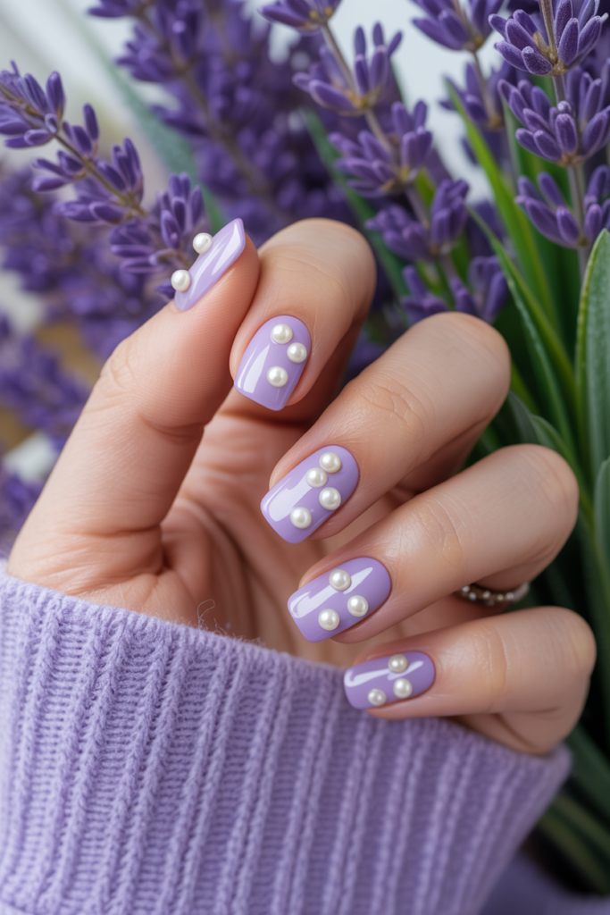 Lavender nails paired with tiny pearls create a soft, elegant look. This combination adds subtle texture and charm without being too flashy.