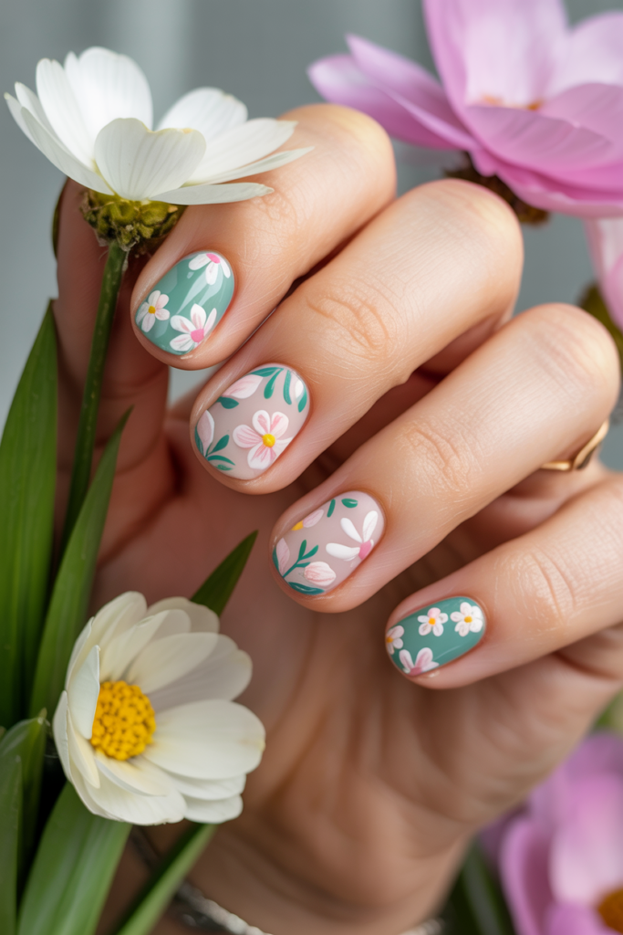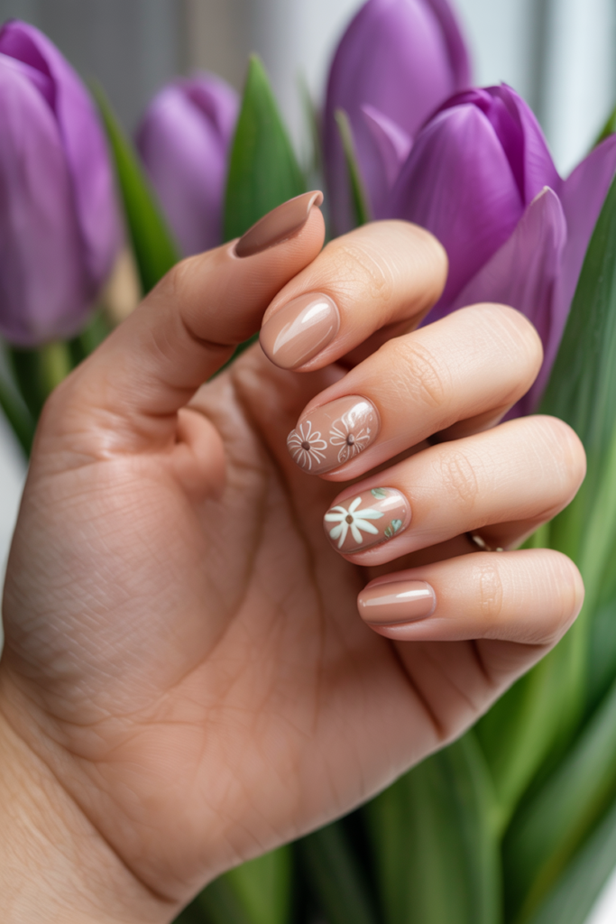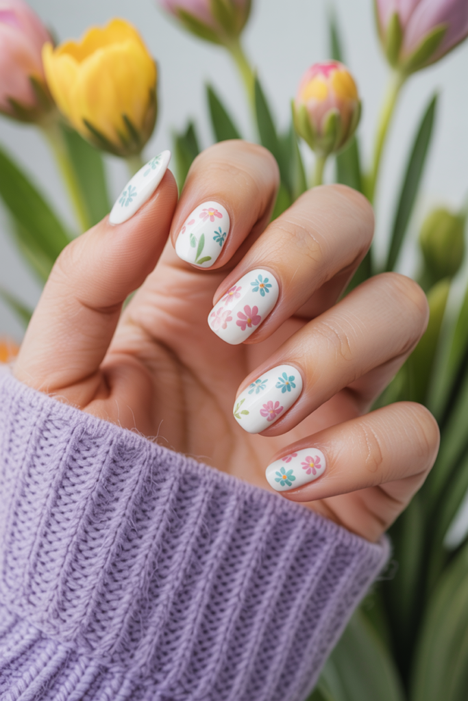 Delicate floral patterns add a soft, elegant touch to spring nails. They often use light colors like pastels and white to create a gentle look. These designs can be simple, with small flowers, or more detailed, combining petals and leaves for a natural effect.