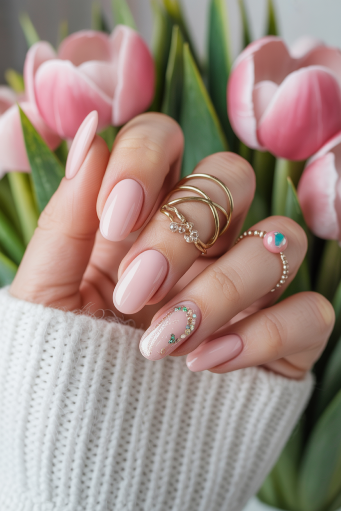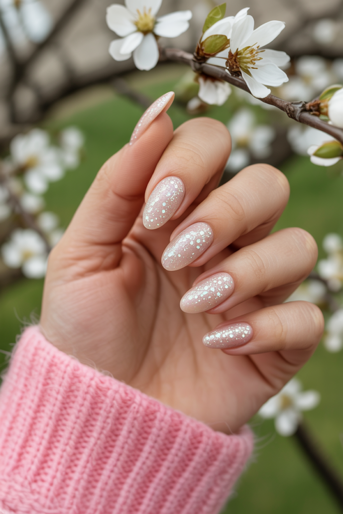 The almond shape offers a sleek and elegant look for spring nails. Adding subtle sparkle, like a light chrome glitter, gives a refined shine without being too bold. This combination works well with soft pink or white tones for a clean, modern style.