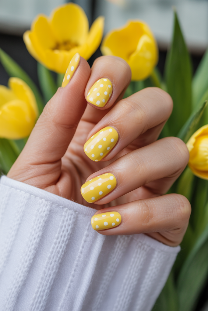 This nail design pairs a soft buttercup yellow base with small, neat white dots. It creates a simple but fresh look perfect for spring. The contrast adds a playful touch without being too busy. It suits many skin tones and works well for casual or more polished styles.