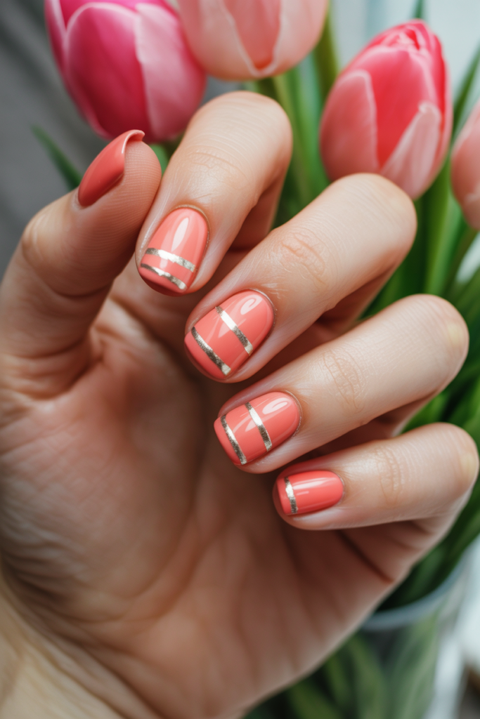 This look pairs a soft coral pink base with thin silver stripes for a clean, modern touch. The silver lines add subtle shine and contrast without overwhelming the nails. It works well on various nail shapes and suits both casual and formal settings.