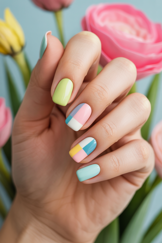 This nail design uses soft pastel colors in bold, geometric shapes. Squares, triangles, and rectangles fit together like a puzzle on each nail.