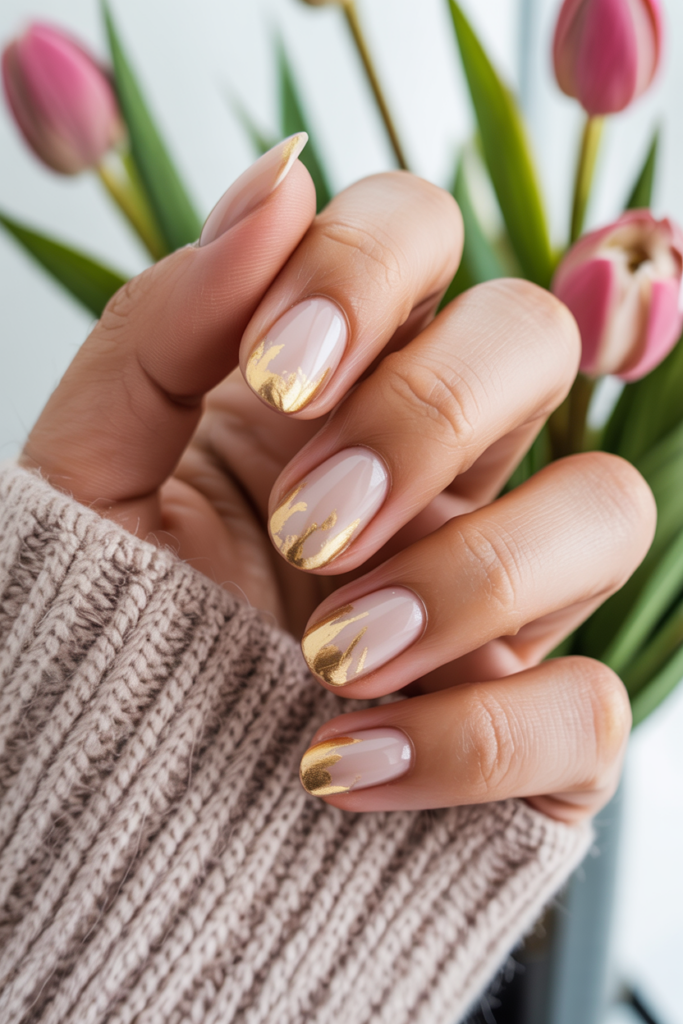 This look pairs soft nude polish with delicate gold foil accents. It creates a simple yet elegant style that suits many occasions.