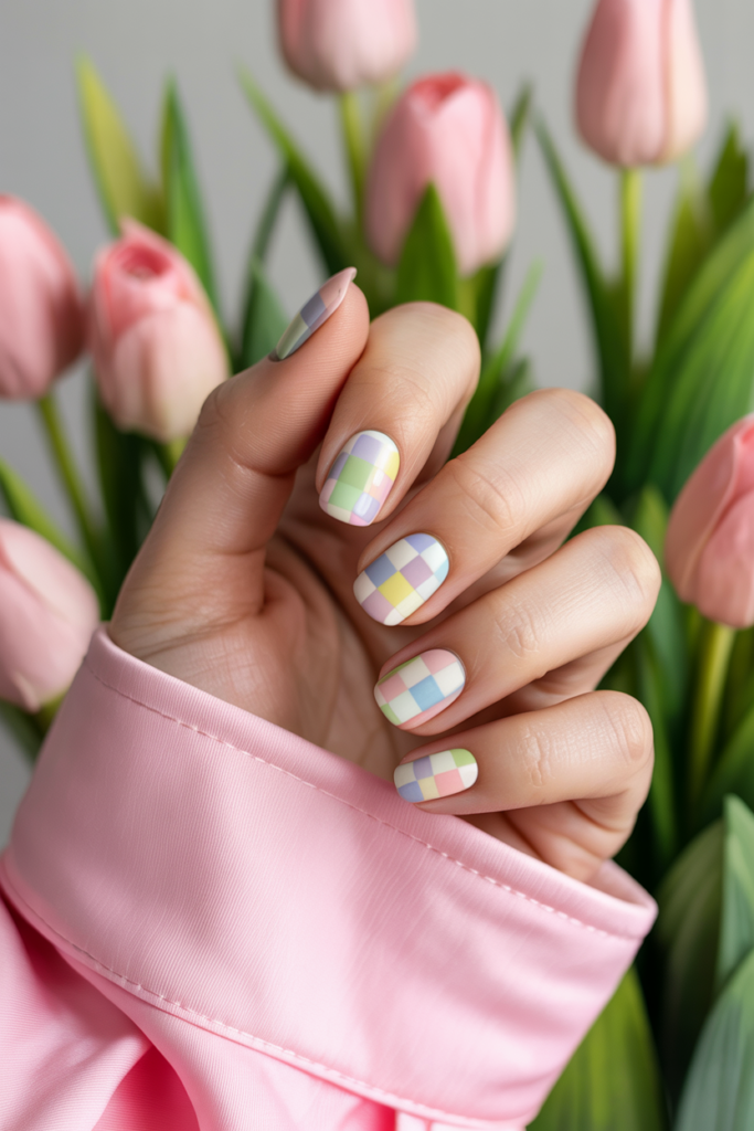 The pastel checkerboard design uses soft colors in a simple square pattern. It blends a playful look with a clean, polished finish.