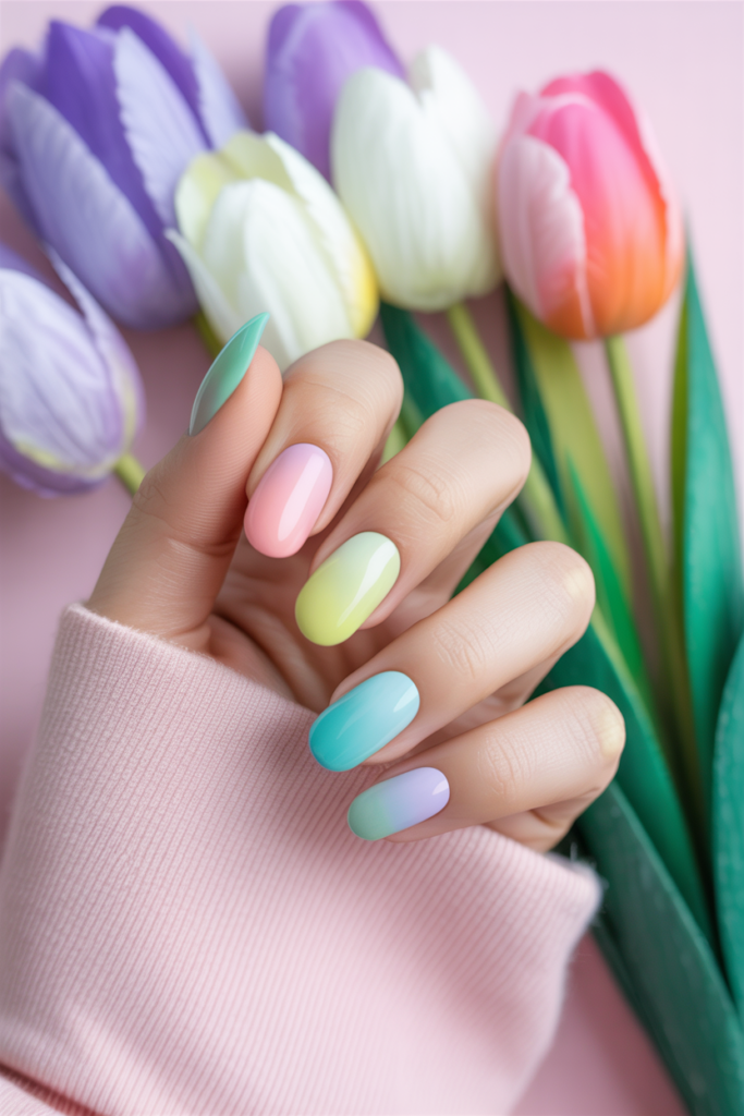 Pastel gradient nails blend soft colors like pink, blue, and lavender. The smooth transition between shades creates a calm and stylish look. This design fits well with spring’s light and fresh feel. It is simple but adds a modern touch to any manicure.