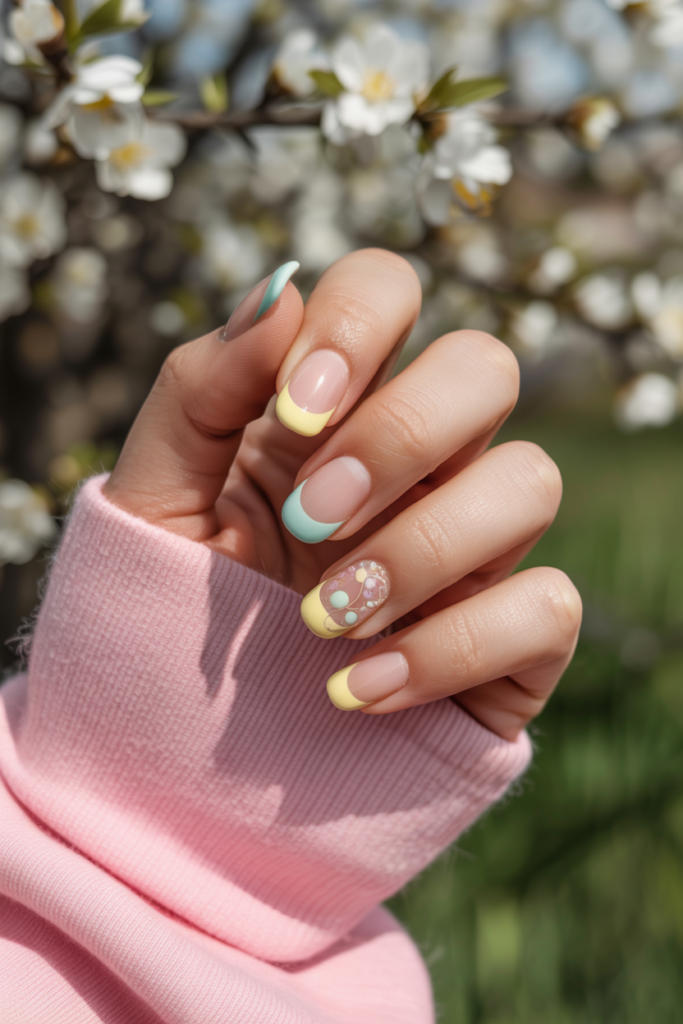 French tips are updated with fresh colors and playful designs. Instead of the classic white, pastel shades and floral patterns add a modern feel.